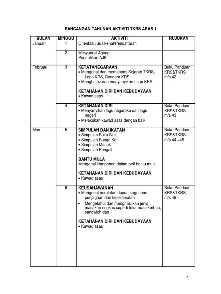 Rancangan Tahunan Aktiviti Tkrs Aras 1 Bulan Minggu Aktiviti Rujukan